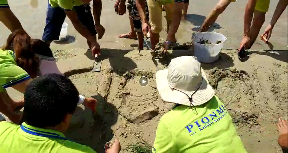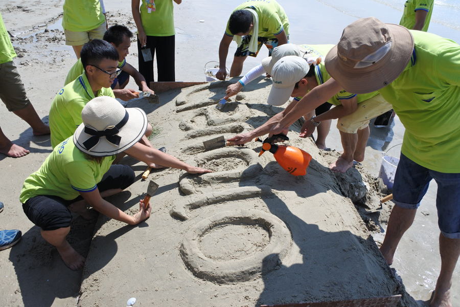 时间只有一小时,面对步步紧逼的潮水,我们分工明确,捡贝壳,堆沙子,雕logo,最终在潮水到来前顺利完成,这就是我们强大的团队,我们的家人。
