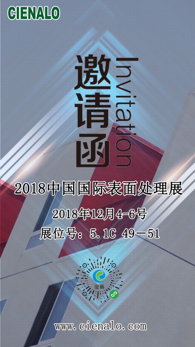 首先感谢您在过去的时光里对澄奥公司的关注和支持!感谢您对我们所有工作的理解和肯定!在此,代表公司全体员工为您送上最真挚的问候和最衷心的祝福!我公司将于2018年12月4-6日参加第三十一届中国国际表面处理、涂装及涂料产品展览会,我们诚挚邀请您亲临展会,参观、指导和洽谈!。