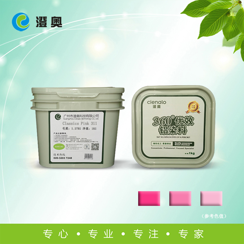 用 途: 适用于铝阳极氧化吸附染色的水溶性染料。产生带蓝色调的粉红色,仅推荐用于室内。不建议使用强烈打气及过滤。